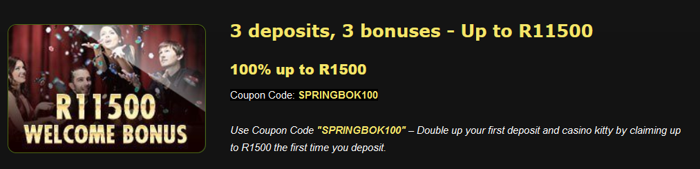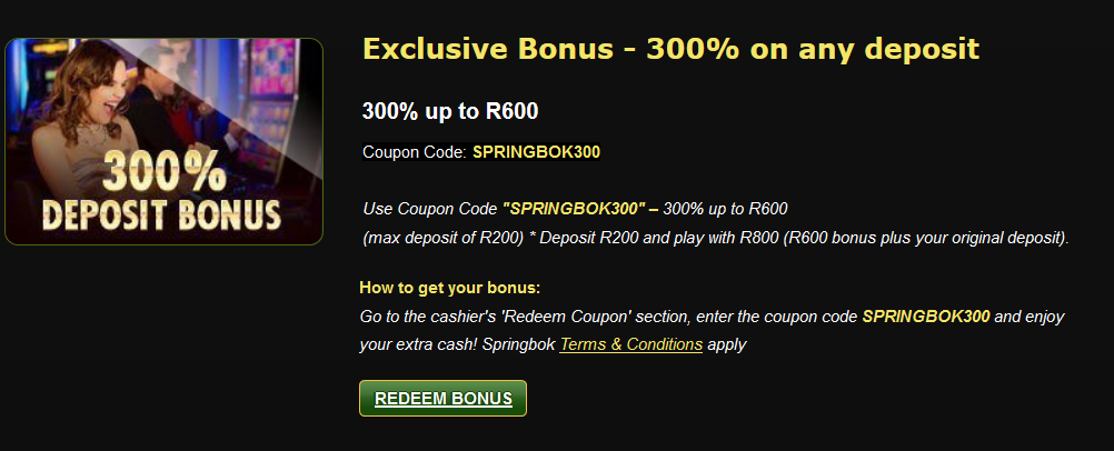 Springbok casino on-line has a new and superlative bonus code program. Thither is no greet bonus code acquainted to us in this academy, nevertheless, when forming a deposition, thither are aloof iii compensation choice, from which you select what you similar better. Representing instance, you buoy move a promo code of 100% up to $ 100, or +100 aims to your accounting (aloof under we desire separate you what it is) or duplicate the amount of aims at an acceptable degree. The bet representing nearly honoraria is fix at round 20x the measure of the promo code and deposition.